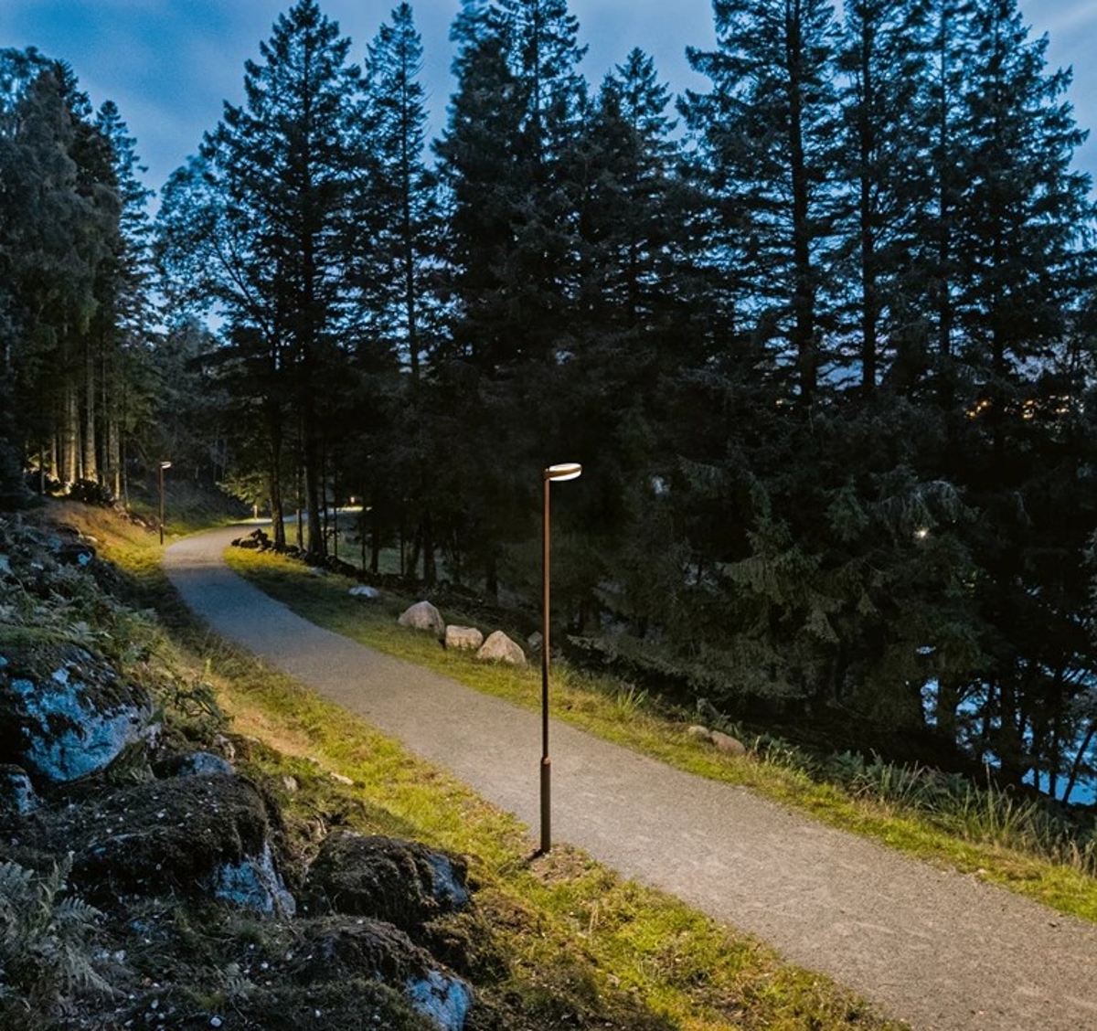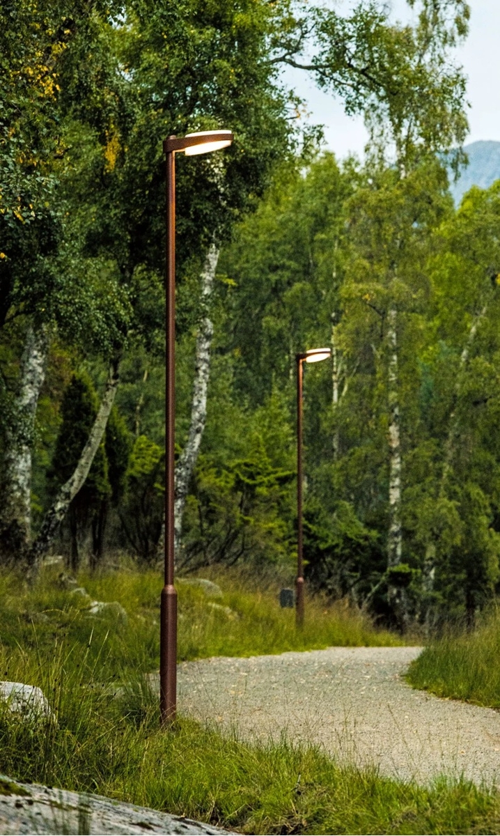 LP Capsule is characterised by a high degree of integration between the design elements. The fixture elegantly encircles the post for a more coherent solution. Viewed from above, the light consists of two circles – a large round lamp and a smaller round post where the tangents connect the two circles to form a simple geometric harmonious look. The basic idea was to create a cylindrical capsule, with the light source inside a single cylinder, which is in turn inside a larger opal cylinder. This is the source of the direct downward light, but by creating distance between the inner and outer cylinders, the fixture shines surplus light into the gap. Here it is reflected, illuminating the outer cylinder, which glows like a halo around the light source in the middle. This reduces glare and provides a smoother transition to the surrounding environment.